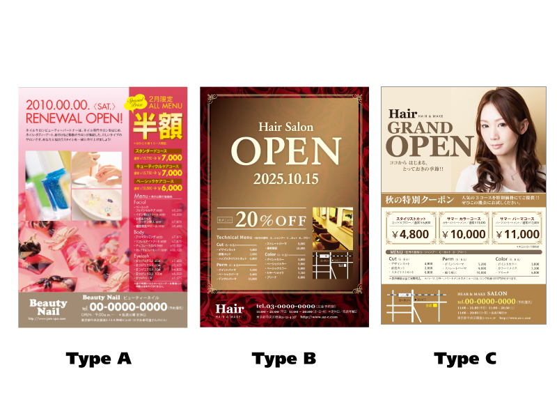 美容室・サロン様向けチラシデザインサイト「ビューティーパートナー」ではサイトに掲載されている過去のデザイン実績例などから気に入ったものをお伝えいただき、そのデザインをベースに、お客さまのサロンに合わせてカスタマイズしながらチラシのデザインを行なっています。