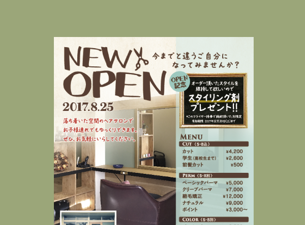 植物のグリーンをアクセントにし、ナチュラルな雰囲気に仕上げたヘアサロンOPENチラシです。